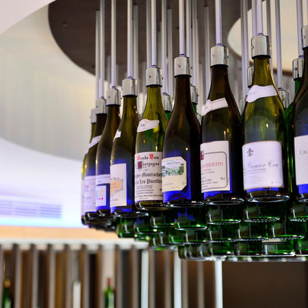 商業空間常常有非常強的主題指向,如果這個主題可以拿來發揮,就不要客氣啦,用盡全力地把主題用到淋漓盡致吧!就像這個案子使用了大量的酒瓶元素,酒瓶的剖面線條,圓形的意象,還有許許多多的酒瓶。光是為了呈現酒瓶所花的功夫真是不在話下,包括研發五金套件,訂製夾具,研究如何安全的將酒瓶吊起,如何將酒瓶呈現在空間的角落中,又不至於太具象。連洗手間的磁磚顏色,都挑選香檳色,並且有圓弧的形象表達香檳中的氣泡。